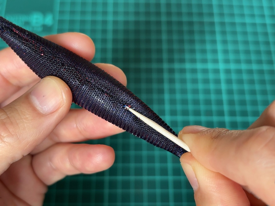 余った布を、腹の溝にピンセットなどを使い埋めていきます。