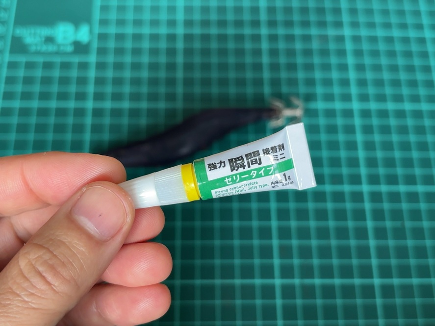 結んだ糸は液体タイプの瞬間接着剤で固定します。