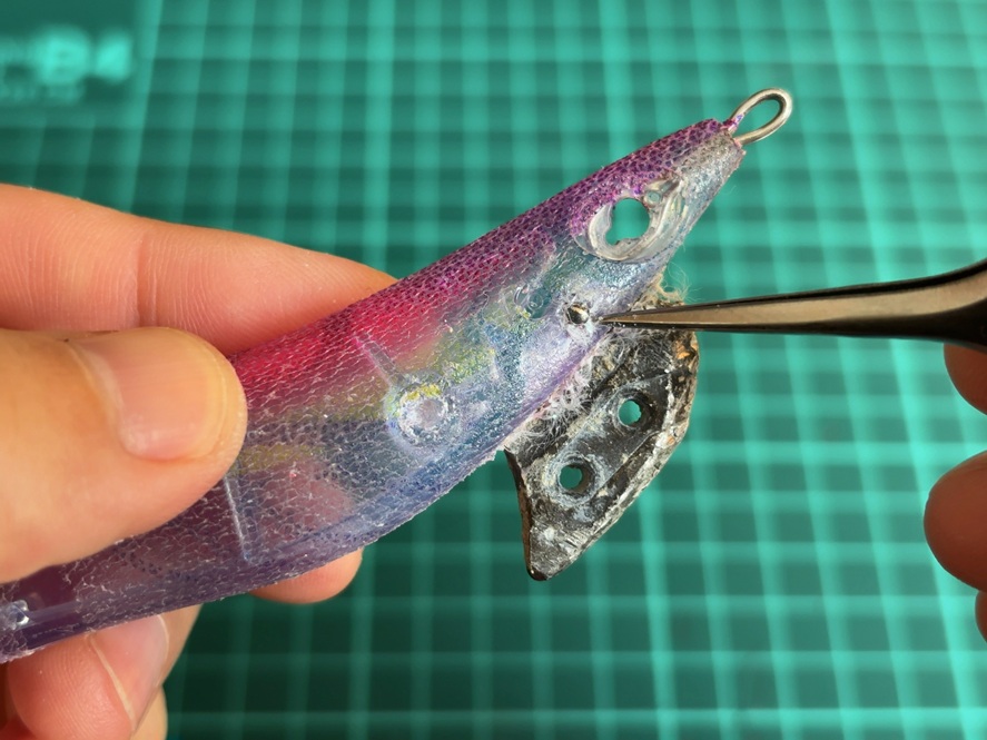 お腹の溝や、シンカー周りもなるべくキレイに剥がしていきます。