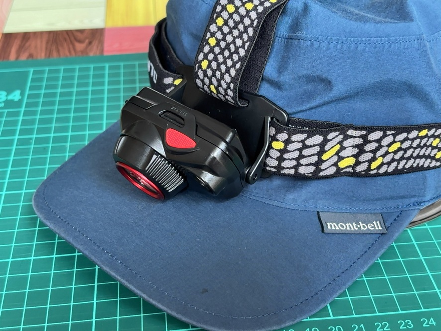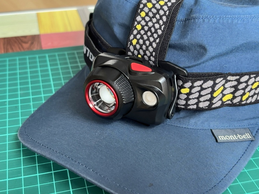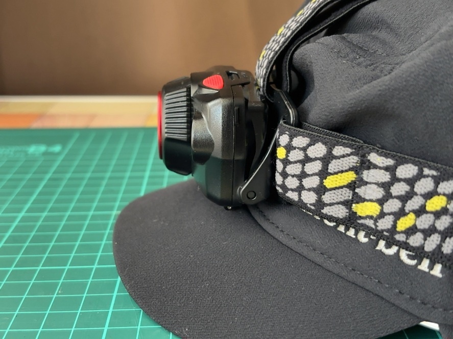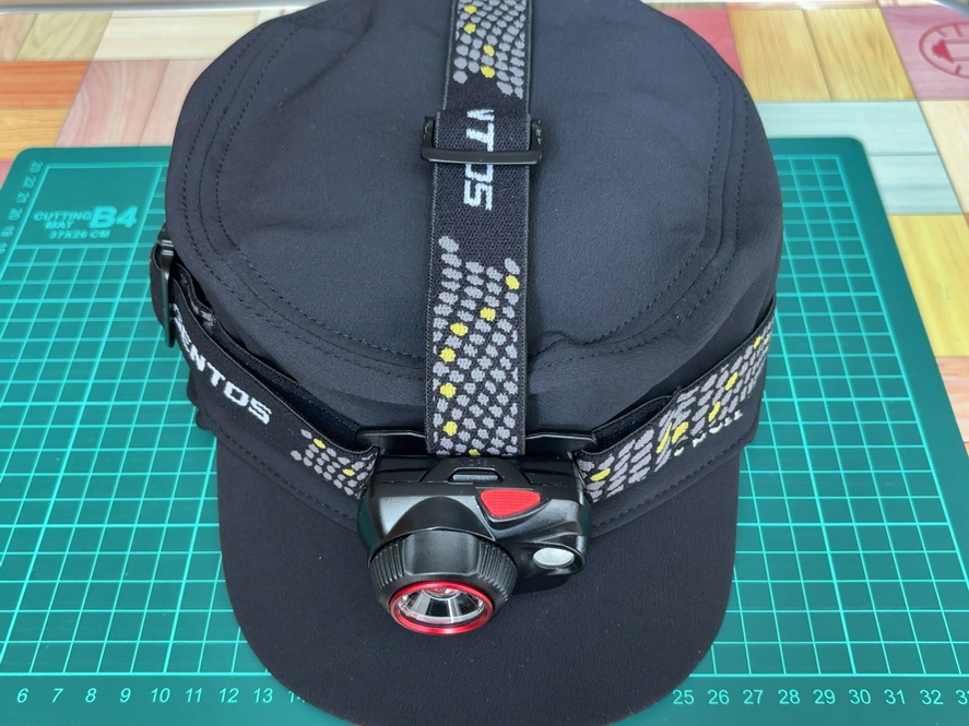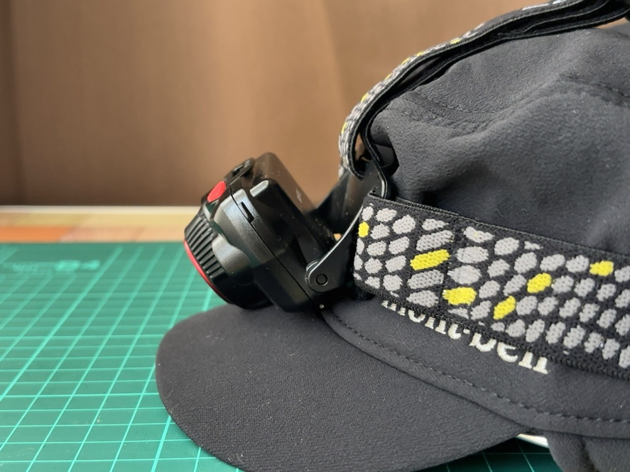 左右のベルトだけではヘッドライトの重みでズレてくる時も、上部のベルトを調整することで解消できます。キャップはツバがあるのであまり気になりませんが、ニット帽などは上部のベルトが非常に役立ちます。