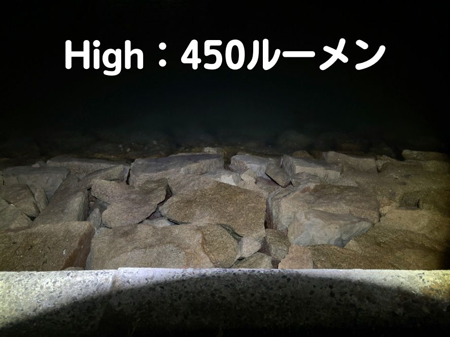 Highモード450ルーメンはかなり明るいです。移動やタモ入れ時はこれで十分すぎる性能です。