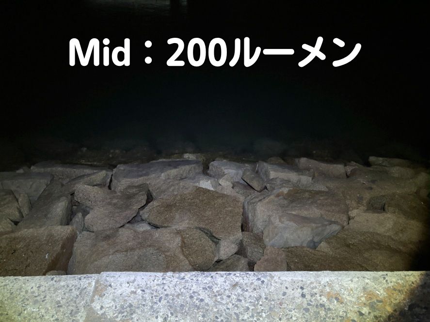 Midモード200ルーメンも十分明るく、ある程度遠くまで照らせるので困ることはありません。電池の消耗も抑えれるのでバランスがいいです。