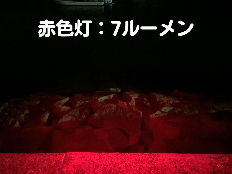 赤色灯7ルーメンでもルアー交換ならできる明るさです。魚にプレッシャーを与えず素早くルアー交換をしたい時にはこのモードが最適です。