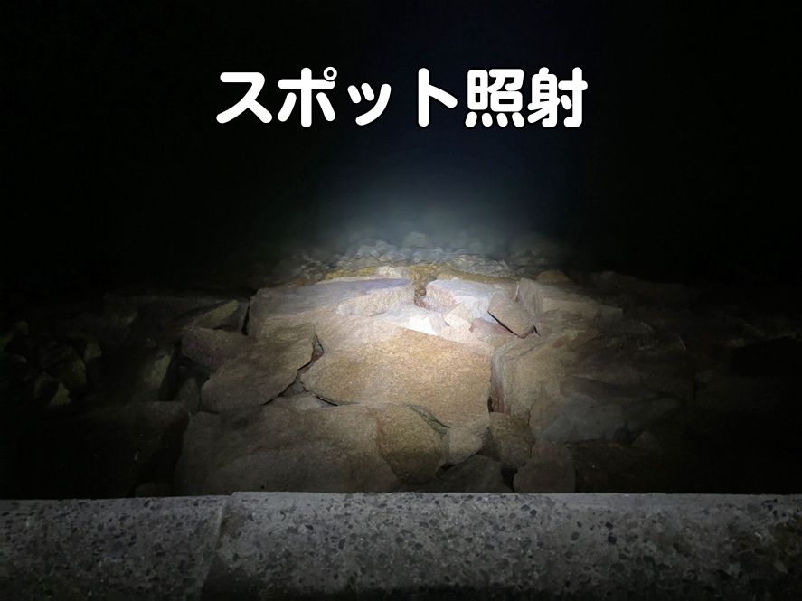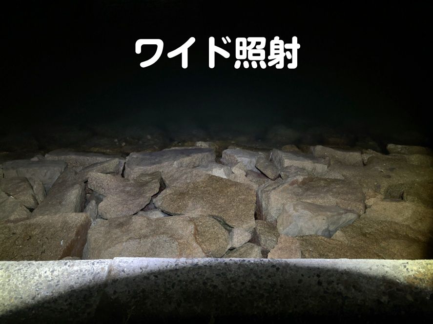 ワイド照射は移動時や準備など広範囲を照らしたい時に、スポット照射はタモ入れや遠くを照らしたい時に便利です。基本的にはワイド照射が使いやすく、状況に応じてスポット照射に切り替える感じです。