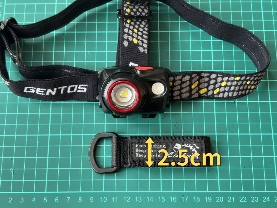 ベルトの幅はリーニアが2.5cm、ダイソーが2.0cmです。ヘッドライトのベルトループの幅がそれ以下のものはベルトを通せないので、手持ちのヘッドライトの幅が何cmなのか確認しておく必要があります。