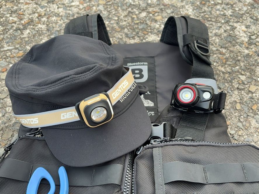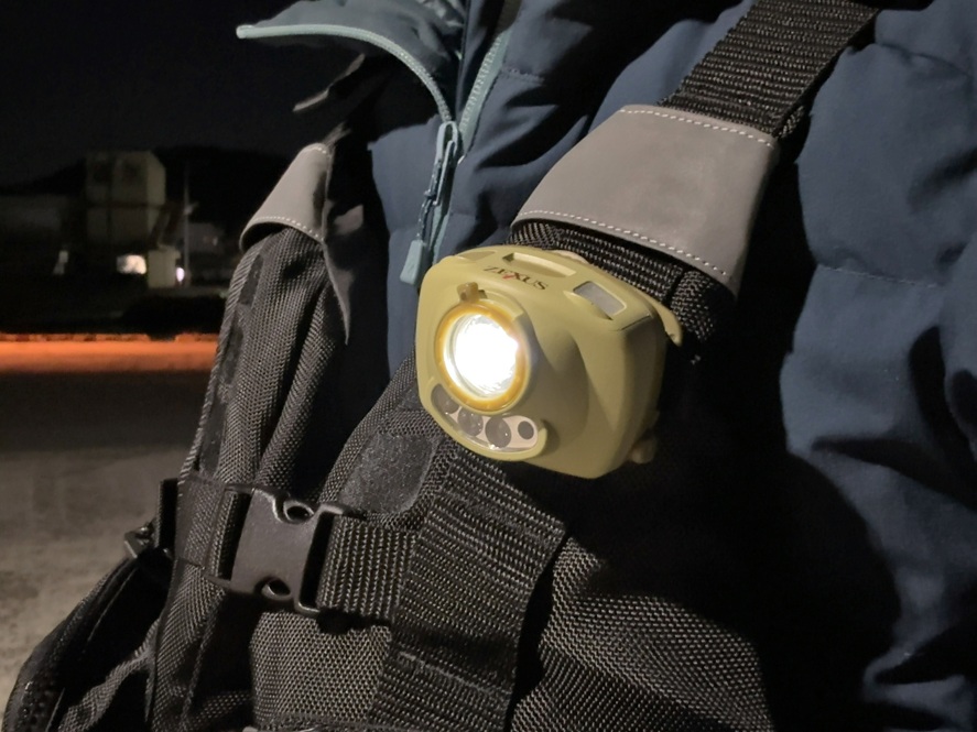 メインのヘッドライトは頭に、サブのライトはフローティングベストに装着。頭側は通常点灯用、胸側は赤色灯用など使い分けることができます。