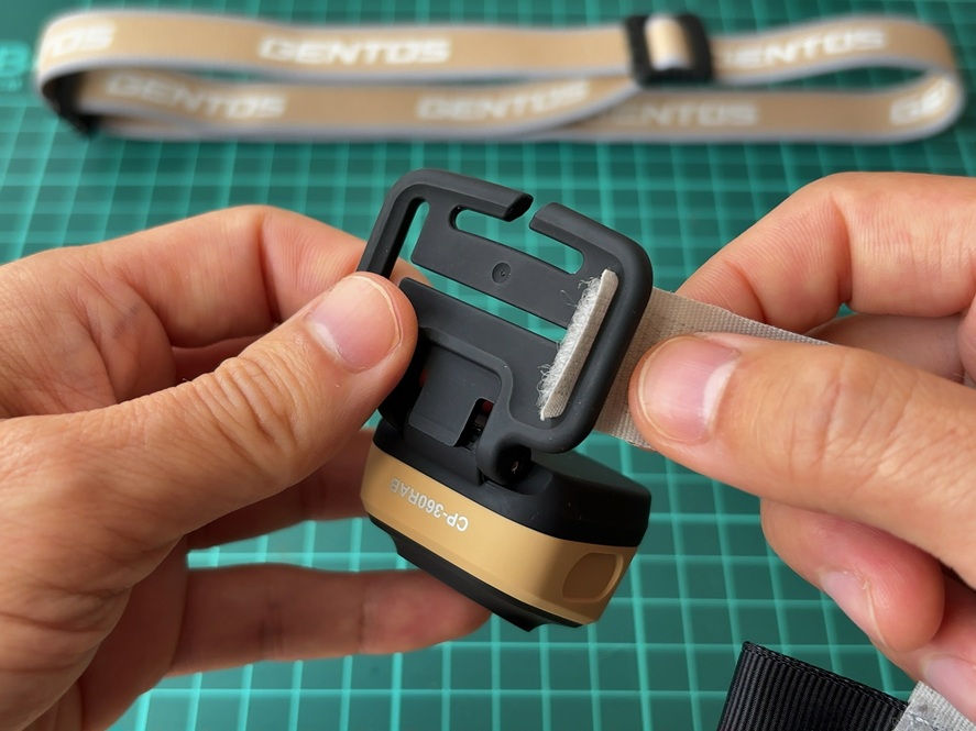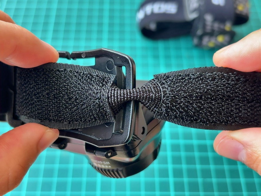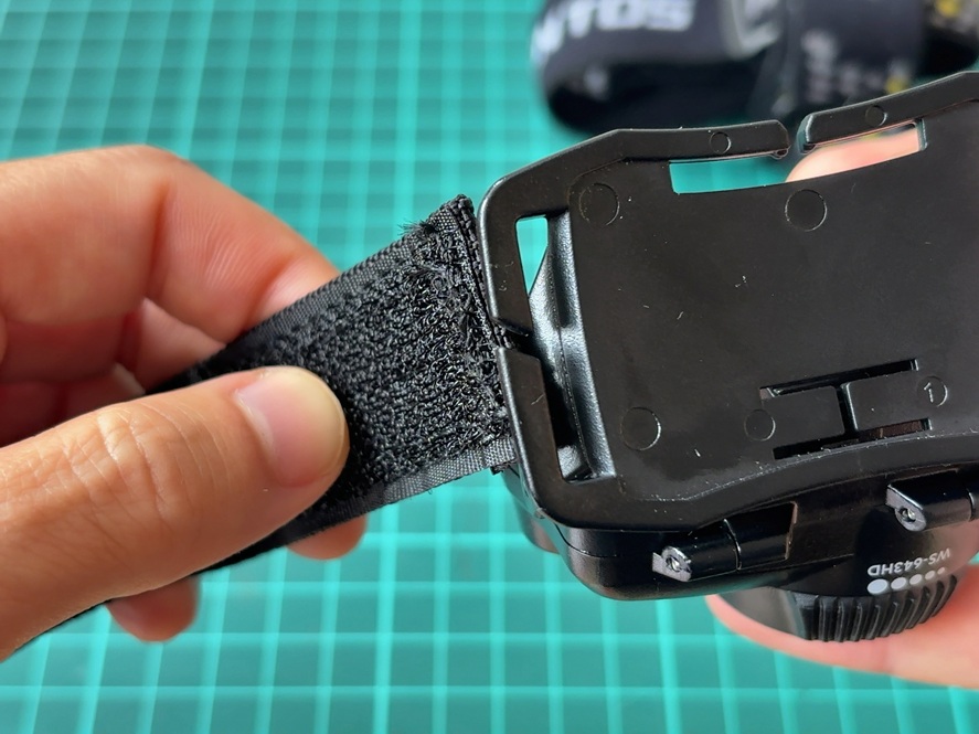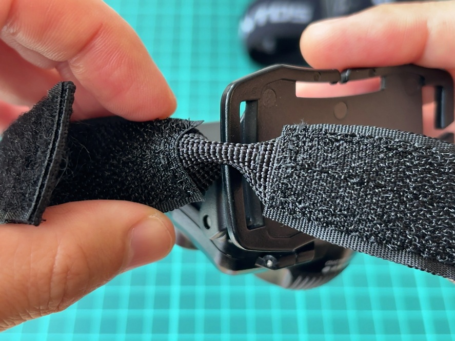 ヘッドライトに取り付ける際は、ベルクロ部は分厚すぎてループに通しにくいので、隙間の薄い部分を使って取り付けていきます。