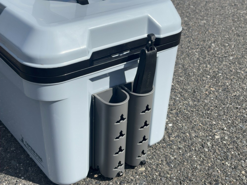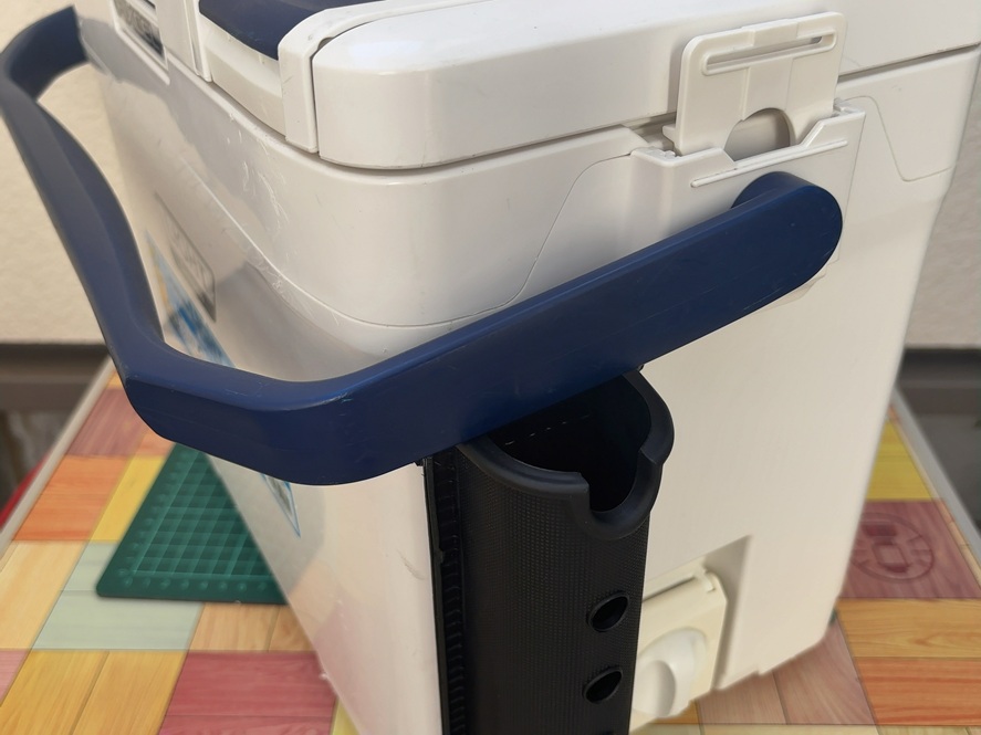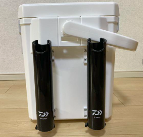 セリアにバケットマウス用のロッドホルダーは、少し加工すればクーラーボックスにも取り付け可能。