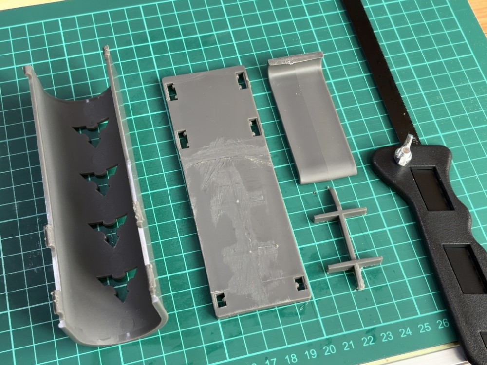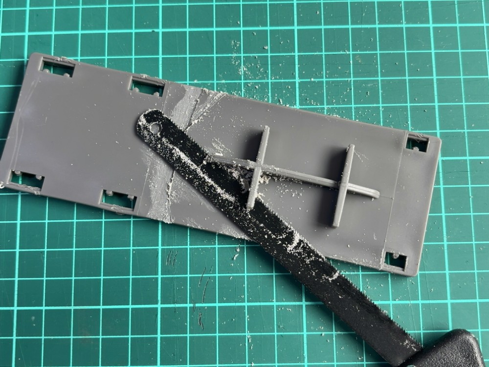ベース部分の裏側の突起となっているパーツを、金切鋸で切り落とします。