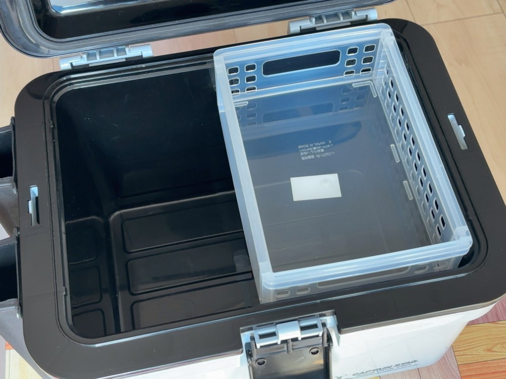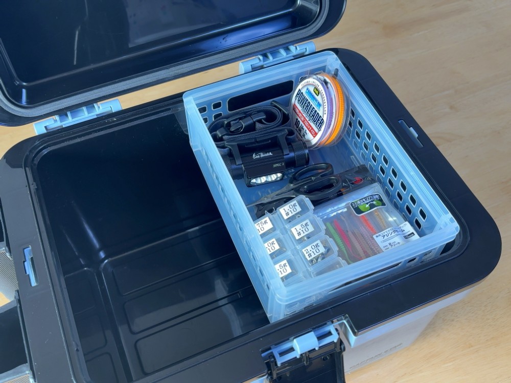 セリアの「コンテナBOX M型」は深型なので収納力があります。リーダーやハサミ、ワームなどのすぐに使いたい小物を入れておくと便利です。