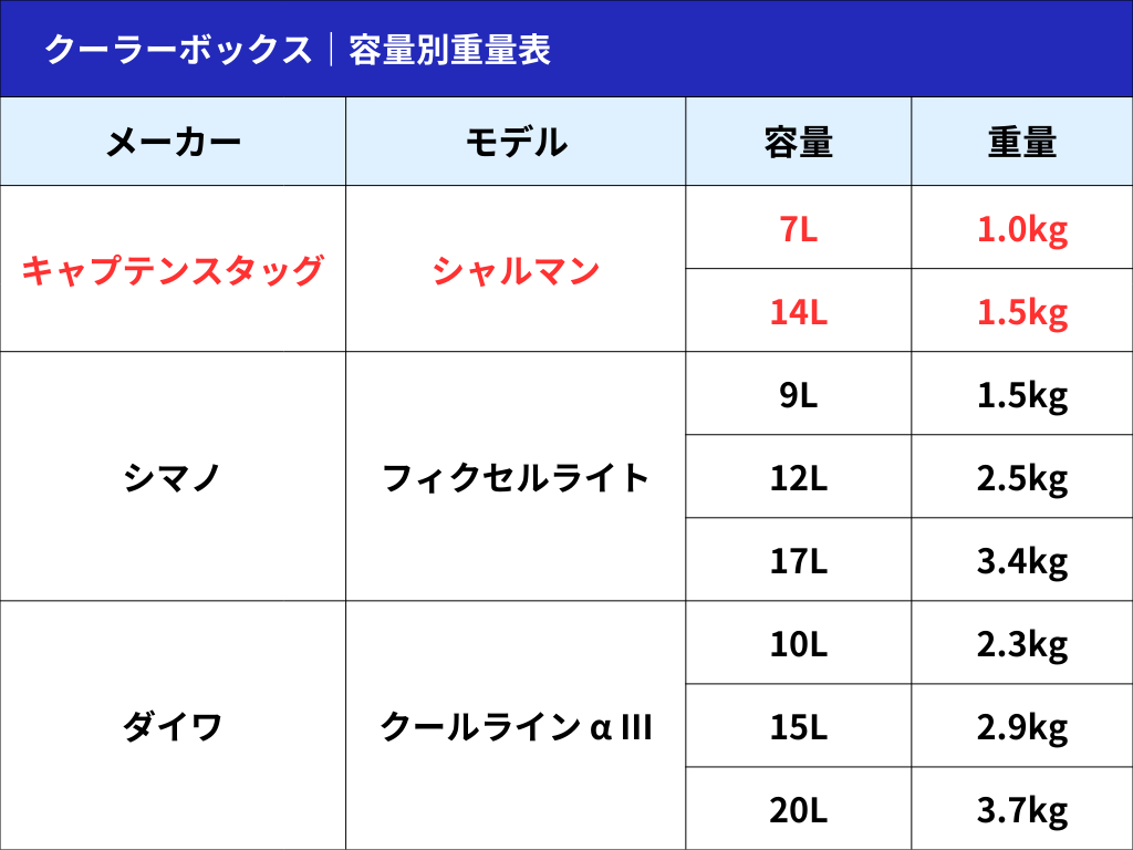 数あるクーラーボックスの中でも、キャプテンスタッグのシャルマンは最軽量の部類になっています。