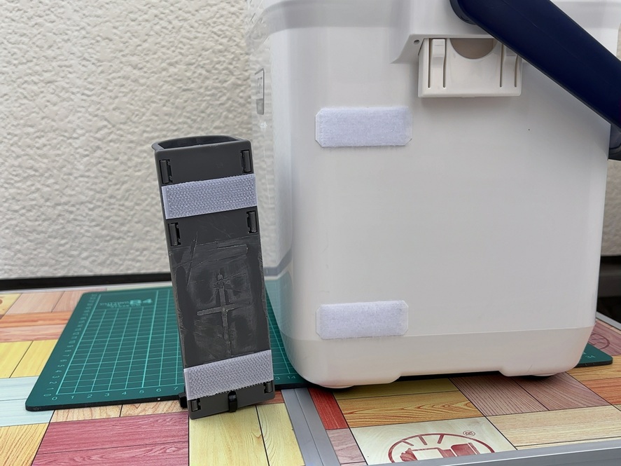 ロッドホルダーをクーラーボックスに固定するのではなく、マジックテープを使いいつでも脱着できるようにしました。